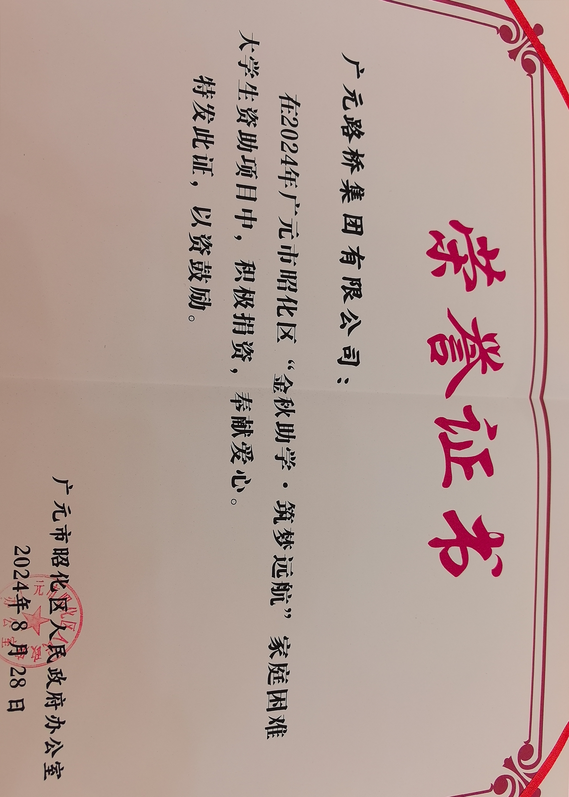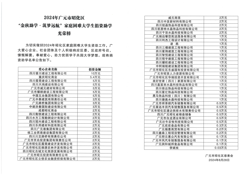 8月28日,昭化区举行2024年“金秋助学·筑梦远航”家庭难题大学生资助仪式,3044am永利集团集团作为资助企业参会并获得表扬。
