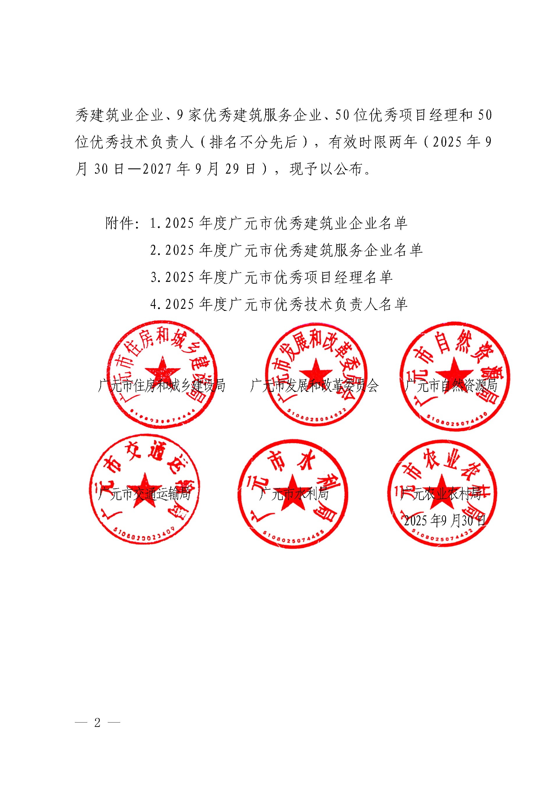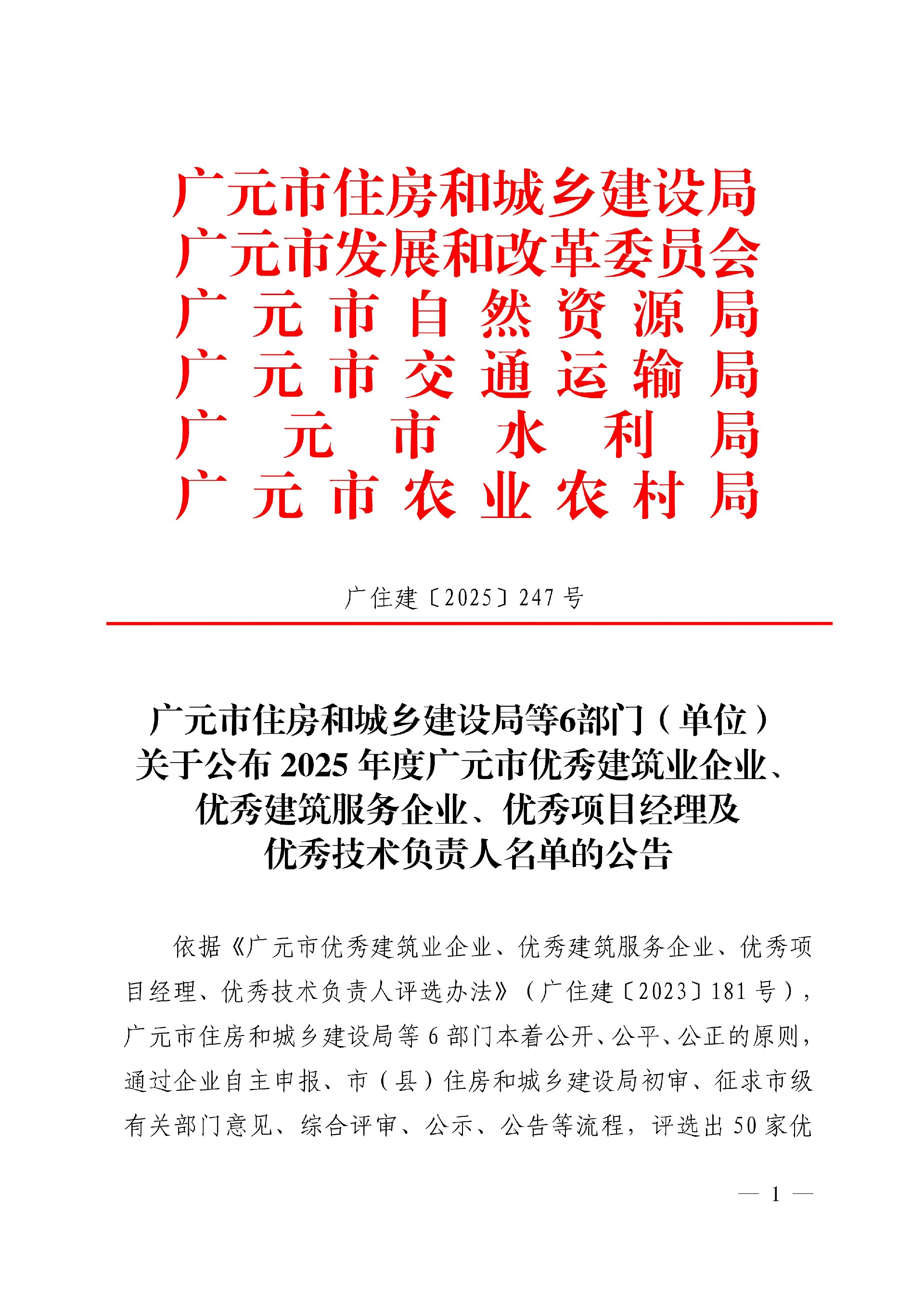 克日,广元市住房和城乡建设局等6部分(单位)宣布了2025年度广元市优异修建业企业、优异修建服务企业、优异项目司理及优异手艺认真人名单,3044am永利集团集团获评“2025年度广元市优异修建业企业”,副总司理母健全获评“2025年度广元市优异手艺认真人”。